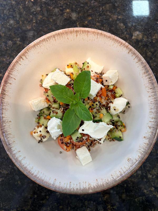 - Em um bowl ou bacia higienizado adicionar a quinoa, o tomate, o pepino, o talo de couve e o queijo;
