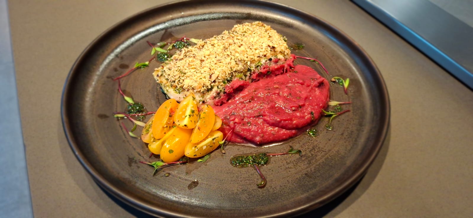 Para servir, disponha o robalo com a crosta de castanha-do-pará acompanhado do purê de beterraba e finalize com os tomates-cereja temperados e o azeite de ervas.